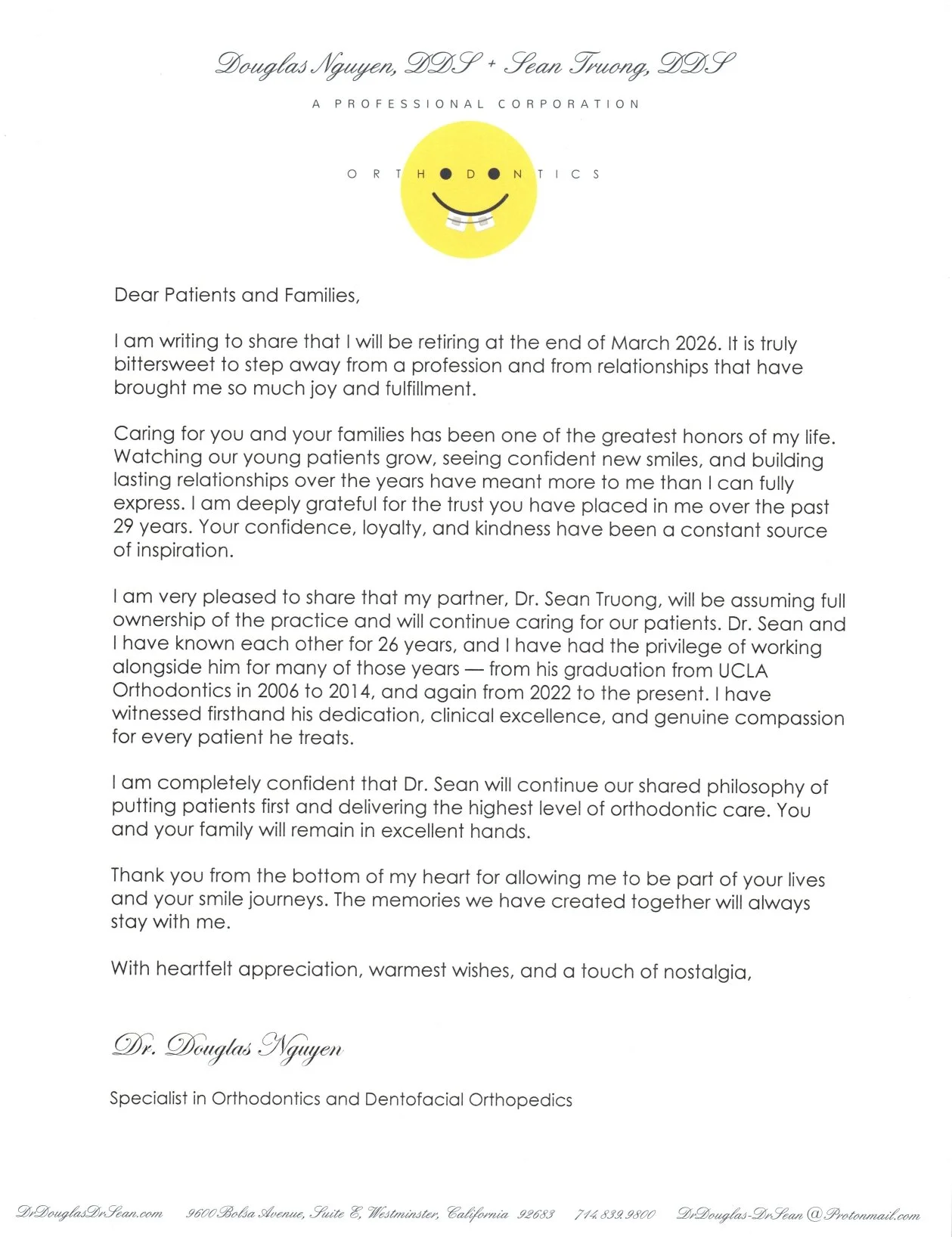 After nearly three decades of dedicated service, heartfelt relationships, and countless transformed smiles, Dr. Douglas Nguyen will be retiring at the end of March 2026.